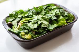 - Kartoffeln in Würfel schneiden (2x2 cm) und zusammen mit Brokkoliröschen, Champignons und Blattspinat in der ggf. mit Kokosöl gefetteten Ofenhexe verteilen.