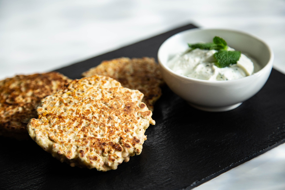 Thermomix Buchweizenpuffer mit Quark-Minz-Dip von oben