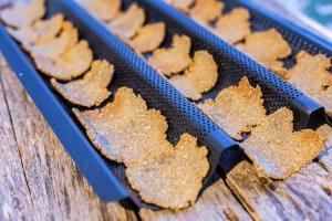 - Auf ein Baguetteblech legen (damit sie die Chips-typische, gewölbte Form bekommen) und nacheinander im Ofen bei 180°C Umluft für ca. 8 Min. backen (die Ränder sollten gut braun sein).