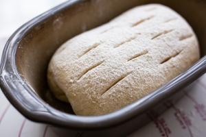 - Teig auf die bemehlte Teigunterlage geben mit etwas Mehl bestäuben, einige Male falten, zu einem Laib formen, in den Zaubermeister legen, bemehlen, einschneiden.