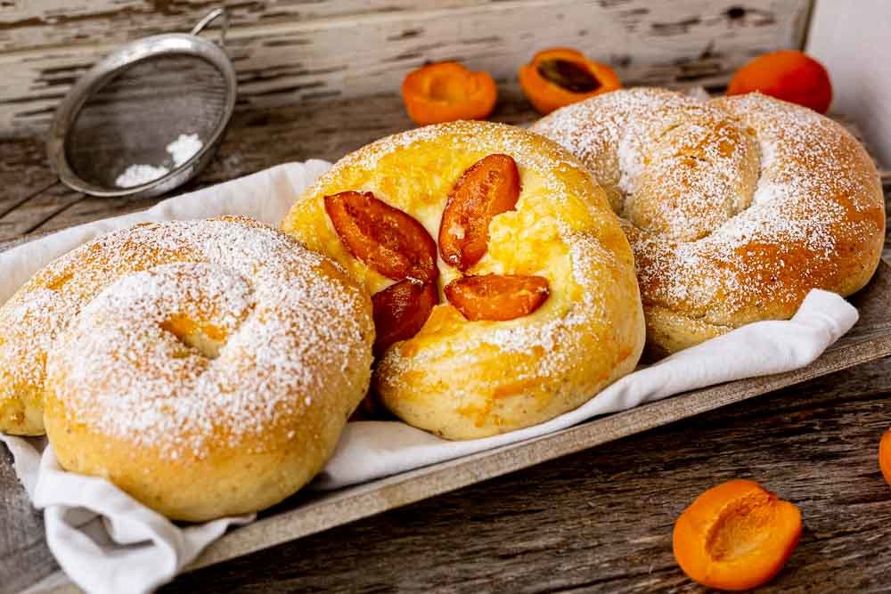Keyword Aprikosen, Ensaimada, Frühstück, Hefe, Hefegebäck, Puderzucker, Schweineschmalz, Vanillepudding
