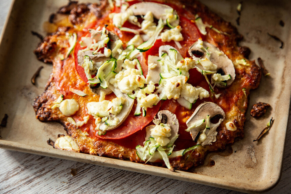 - Blumenkohlteig mit passierten Tomaten bestreichen und nach Belieben belegen. Ich nehme gern frische Tomaten, Champignonscheiben, geraspelte Zucchini und Fetakäse.