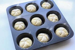- Mit der Wundercard in 9 Teile teilen, diese schleifen und zu Brötchen formen und in die Mulden des Brötchenblech legen.