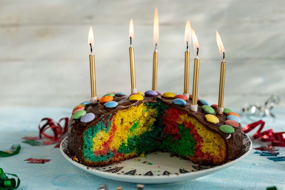 - Teig gleichmäßig auf vier Schälchen verteilen und jedes Schälchen mit etwas Lebensmittelfarbe versehen (ich habe gelb, rot und blau benutzt – aus gelb und blau habe ich grün angerührt). Lebensmittelfarbe gleichmäßig verrühren.