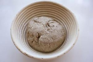 - Teig auf die bemehlte Teigunterlagen geben, bemehlen, einige Male falten, in eine runde Form bringen und in das Gärkörbchen legen und mit einem Küchentuch abdecken.
