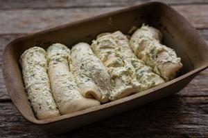 Kräuterbutter auf dem ausgerollten Teig verteilen und den Teig längs halbieren.