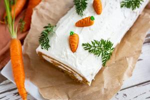 Vor dem Servieren optional mit Marzipan-Karotten und Möhrengrün dekorieren